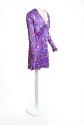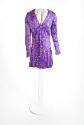 About MeGirls' purple floral pattern minidress.The low V neck ends at the curved bust line with a slight crossover. The sleeves are narrow. The high hemline of the miniskirt and dress began to become a fashion statement in the 1960s. Dated to the 1960s or 1970s.