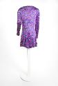 About MeGirls' purple floral pattern minidress.The low V neck ends at the curved bust line with a slight crossover. The sleeves are narrow. The high hemline of the miniskirt and dress began to become a fashion statement in the 1960s. Dated to the 1960s or 1970s.