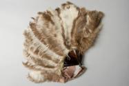 About MeNatural ostrich feather fan.The fan has tortioseshell sticks and a tortoiseshell ring and the feathers are arranged to show alternate light and dark fawn edges. Attached to the ring is a mushroom coloured satin ribbon tied in a dangling bow.