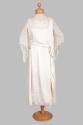 The marriage of Lady Elizabeth Bowes-Lyon to the future King George VI took place in the same year. There was so much hype about Lady Elizabeth's bridal gown leading up to the big day that the 'Daily Sketch', a British tabloid newspaper, was permitted to publish a drawing of the dress before the event. Although this dress has a shorter hemline than the gown worn by Lady Elizabeth, it features the same deep neck-line, loose fitting bodice and drop waist, which was fashionable at the time, as well as handkerchief sleeves similar to those found on Lady Elizabeth's bridesmaids' dresses. The decoration on this dress is simpler by comparison, with its delicate row of pearls on the sleeves and orange blossom at the waist.
