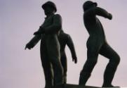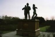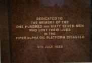 About MeThe memorial to the men killed in the Piper Alpha disaster on 6 July 1988 is sited in the Queen Mother's Rose Garden in Hazlehead Park and was unveiled by her in 1991. It comprises three seperate standing bronze figures, their backs to one another, representing offshore oil workers. The central figure facing north represents a mature character. In his left hand he holds a pool of oil sculpted in the shape of an unwinding spiral form. This black shape in his palm flows into the gold leaf. His right hand points down to the ground, indicating the source of crude oil. The carved motif on his helmet, a fish and sea birds design, symbolises the environment. The figure facing west represents a roustabout drill-deck worker, showing pushing and pulling movements. On his right sleeve is a celtic tree of life motif, the leaves gilt. The figure facing east wears a survival suit and on his left sleeve is a sea eagle spread winged with a gilt head, native to the North seas. To the rear is a small stone plinth with a cross behind which has an urn of ashes interred within the plinth.