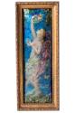 The figure of 'Spring' is depicted against a striking blue background with golden curls and large angel-like wings coloured purple. She is draped in swathes of fabric covered in flowers which swirl round her form and stands in a side pose reaching up to pick a pink rose hanging from above. In the other hand she holds a small bird while more birds flutter at her legs. Intricate jewel coloured flowers, bluebells, crocuses and forget-me-nots burst from the foreground.