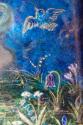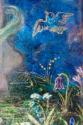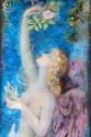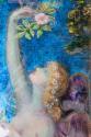 The figure of 'Spring' is depicted against a striking blue background with golden curls and large angel-like wings coloured purple. She is draped in swathes of fabric covered in flowers which swirl round her form and stands in a side pose reaching up to pick a pink rose hanging from above. In the other hand she holds a small bird while more birds flutter at her legs. Intricate jewel coloured flowers, bluebells, crocuses and forget-me-nots burst from the foreground.