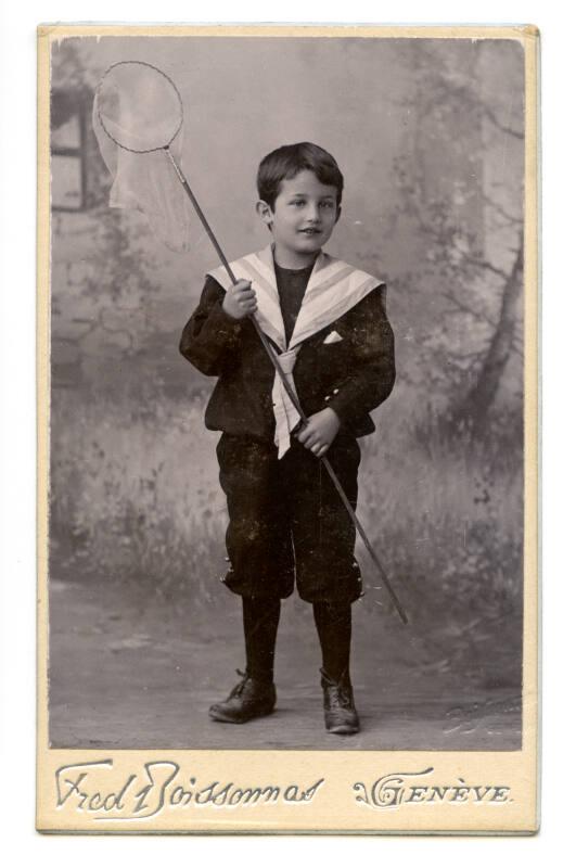 About MeA carte de visite or photograph of a young boy (aged 5) holding a fishing net. Set against a backdrop depicting a country scene. Inscription on the back reads: "15 June 1896 5 years" (translated from French).Exhibitions