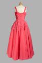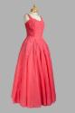 Woman's pink acrylic evening dress. Zip openings at front and back. Ribbing around torso. Decoration around torso and on shoulder straps. Three layered skirt.