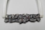 Electroforming replicates sculptural shapes with partial or minimal layers of fine silver, combining potential combinations of soft and hard forms, which is what can be seen here on the necklace's plastic crescent and the series of small pewter- coloured flowers which make up the decorative element of the neckpiece.