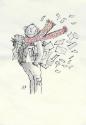 This sketch was made by Blake to serve as a poster image for his exhibition at Aberdeen Art Gallery in 2004. A jaunty self portrait it shows Blake clutching a sheaf of drawings and wearing, appropriately for the venue, a tartan scarf.