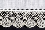 Bobbin lace is made by braiding and twisting lengths of thread, which are wound on bobbins to manage them. As the work progresses, the weaving is held in place with pins set in a pillow. The placement of the pins is usually determined by a pattern.
