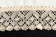 Bobbin lace is made by braiding and twisting lengths of thread, which are wound on bobbins to manage them. As the work progresses, the weaving is held in place with pins set in a pillow. The placement of the pins is usually determined by a pattern.