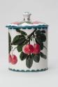 Preserve jars were made in seven different shapes and sizes ranging from the tiny individual pot for the breakfast tray to the outsize one for nursery teatable. This particular example has the early swagged green rim to both pot and cover, which also appears on the bee and honey pots. The mark on the base shows that it was manufactured for the London china retailer Thos. Goode and Co.