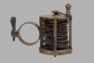Brass end plates with four pillars, the fourth being flat with the circular clamp (with screw) secured to it. The handle is straight with a brass knob.
