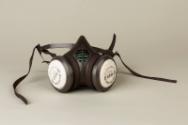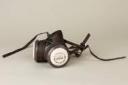 About MeGrey moulded face mask with original box and instruction leaflet.The mask has two protruding circular holes (one either side) which are fitted with white dust filters. The elastic for the head fitting wraps around these and are attached at the back to a thin plastic headband. the handband is elliptical and shaped to fit around the head and over the crown.