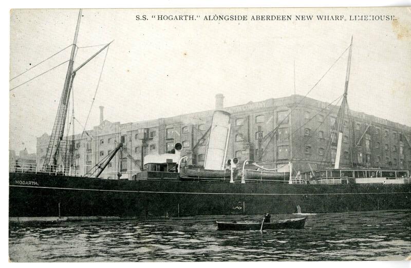 Postcard of steamship Hogarth at Aberdeen Wharf, Limehouse, London