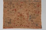 There are trees, flowers and the outline of a house embroidered on the lower part of the sampler.