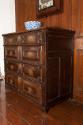About MeOak chest of drawers with a top comprising 4 planks above 4 long drawers with central cast brass medallion keyholes and flower and ring handles. There is also an applied moulding to imitate panels, panelled sides and 4 block feet.c.1650