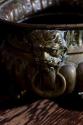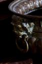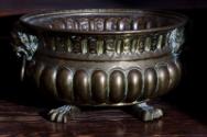 About MeBrass wine cooler with an ovoid body featuring a pinched waist, moulded gadrooning and a flared rim. At the narrower ends there are two lion masks with ring handles in their mouths, attached to the cooler with two nuts and bolts. The wine cooler sits on four claw feet.