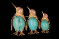 About MeAn 18ct gold set brooch modelled as a waking group of three graduated penguins with turquoise set bodys and gem set eyes.The brooch was given as a wedding present in 1961 to Marybell Drummond (b. 1939), who is the daughter of Frances Farquharson of Invercauld.