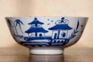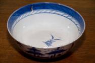 About MeChinese deep circular pottery bowl with a raised base. The bowl is decorated with white ground and blue interior. On the interior is a 'herring bone' rim with a plant in the centre. On the exterior is a Japanese scene with a river, islands, boats, houses, trees and birds.Kuang-Hsu Dynasty, 1875-1908