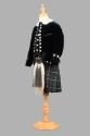 About MeBoy's black velvet kilt jacket edged and decorated on 'pocket' flaps and cuffs with black braid. Rectangular white metal regimental style buttons edge each front side, 3 are used on each cuff, and 3 to decorate each of the 4 pocket style flaps, front and back. A cream cotton broderie anglaise scalloped Peter Pan collar has been tucked round the neck. It has a right breast pocket. The broderie is lined in black satin, the sleeves in white cotton.1880s
