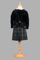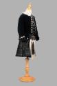 About MeBoy's black velvet kilt waistcoat edged with black braid, which is also used to outline and decorate the two fake pocket flaps at the waist. It fastens with 6 rectangular white metal regimental style buttons, 3 of which are used as decoration on each flap. The waistcoat back is black satin and it is lined throughout with white cotton.1880s