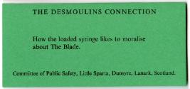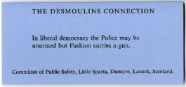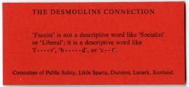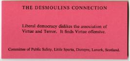 About MeNine cards, each a different colour, folded and placed one on top of the other. Each card is printed with the title ("The Desmoulins Connection") and issuer (Committee of Public Safety, Little Sparta, Dunsyre, Lanark, Scotland) as well as a different quote relating to the Saint-Just Vigilantes, The War of the Letter, or The Little Spartan War. This work is part of an archive that belonged to Joyce Laing, OBE. The artist, Ian Hamilton Finlay, was a personal friend and sent her an example of each new poem print and multiple as it was made.
