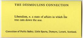 About MeNine cards, each a different colour, folded and placed one on top of the other. Each card is printed with the title ("The Desmoulins Connection") and issuer (Committee of Public Safety, Little Sparta, Dunsyre, Lanark, Scotland) as well as a different quote relating to the Saint-Just Vigilantes, The War of the Letter, or The Little Spartan War. This work is part of an archive that belonged to Joyce Laing, OBE. The artist, Ian Hamilton Finlay, was a personal friend and sent her an example of each new poem print and multiple as it was made.