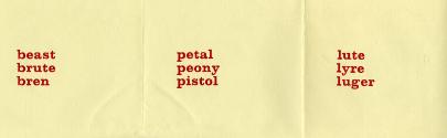 About MeFolding lithograph by Ian Hamilton Finlay and printed by the Wild Hawthorn Press. It features a chant of three-word alliterative phrases, each printed on a square of the paper, which is folded into twelve, e.g. petal/ peony/ pistol. The text is printed in blood red on cream paper.This work is part of an archive that belonged to Joyce Laing, OBE. The artist, Ian Hamilton Finlay, was a personal friend and sent her an example of each new poem print and multiple as it was made.