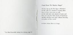 About MeBooklet designed by Ian Hamilton Finlay and Gary Hincks, printed by the Wild Hawthorn Press on 4 pages. It begins: Found Poem: The Mastless Barges