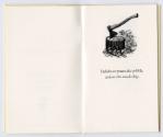 About MeStapled book with a cream card cover and 11 pages. Each of the five proverbs referred to in the title is accompanied by an illustration by Kathleen Lindsley. The back page explains that the book is an edition of 250 copies issued Christmas 1989. It was sent to Joyce Laing in a white envelope dated December 25 and the back page is dedicated to her.This book is part of an archive that belonged to Joyce Laing OBE. The artist, Ian Hamilton Finlay, was a personal friend of the donor.