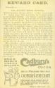 About MeThere were 32 cards in the series (23 are in AAGM's collection see also ABDMS082368.1 - 082368.23), which was published in 1910 for use in Schools and Sunday Schools as a prize for good attendance. The first edition was published with 'Compliments of the Proprietors of Cadbury's Cocoa' printed on the front. A slightly changed version was re-issued in the 1930s with 'Compliments of Cadbury Bros. Ltd.' printed on the front.