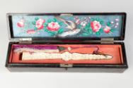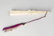 About MeThe fan has 16 ivory sticks. The front and back ones have carved patterns of figures, willow trees, lotus flowers, pavilions, pine trees and bamboo leaves. The middle sticks are much thinner and individually designed; each has pierced background and figures in various poses.