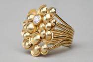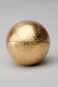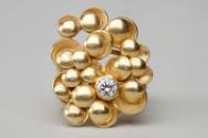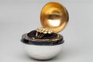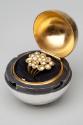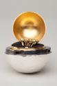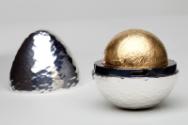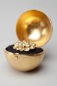 The object consists of three elements; a hammer finished silver egg which divides into two. Inside the silver egg is a round silver gilt box, which is etched with the impression of the world on the surface. This has a small hinge, which when pressed opens up to reveal an 18ct gold sculptural ring set with a diamond, which nestles into a black satin bed.