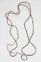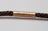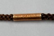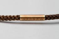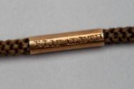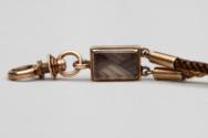 About MeLong gold metal and plaited human hair necklace watch chain.The necklace is made from the hair of Sir James and Lady Gordon's living daughters, Sophia, Adelaide, Elizabeth, Salvadora, Maria, Lydia and Hannah. Each name is inscribed on the gold intersections between each section of plaited hair.