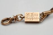 The necklace watch chain terminates at the bottom with a rectangular gold metal, glass covered keepsake locket containing the hair of Sir James and Lady Gordon (blonde/grey and brown). The back of the locket is inscribed with their names.