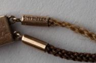 About MeLong gold metal and plaited human hair necklace watch chain.The necklace is made from the hair of Sir James and Lady Gordon's living daughters, Sophia, Adelaide, Elizabeth, Salvadora, Maria, Lydia and Hannah. Each name is inscribed on the gold intersections between each section of plaited hair.
