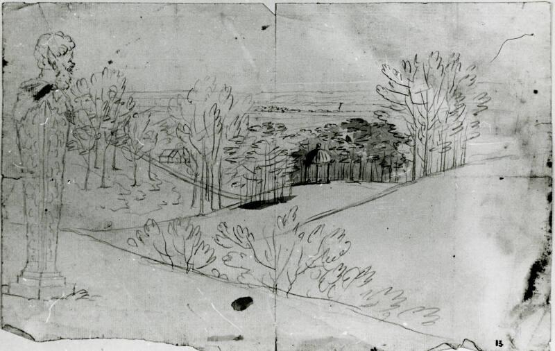 About MeOne of 99 drawings on 92 leaves of paper from a sketchbook used by William Williams.Landscape composition with a statue of Pan on the left hand side of the image, with a small classical round temple in the middle distance, with a valley in the further distance.