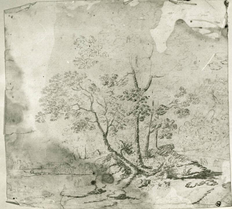 About MeOne of 99 drawings on 92 leaves of paper from a sketchbook used by William Williams.Tree lined banks of a river or lake with a bridge in the middle distance.