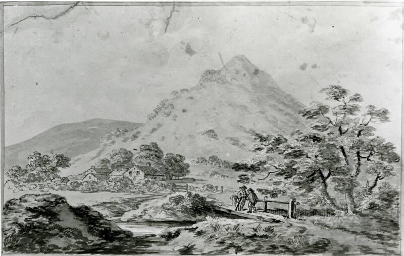 About MeOne of 99 drawings on 92 leaves of paper from a sketchbook used by William Williams.A watercolour of blue and grey with some warm underpainting. Landscape with a conical hill in background to the right of centre, with cottages in the middle distance on the left . There are two figures on the footbridge in hte foreground. It is framed with a wash line surround with "Stanton Vissey" just outside the margin.