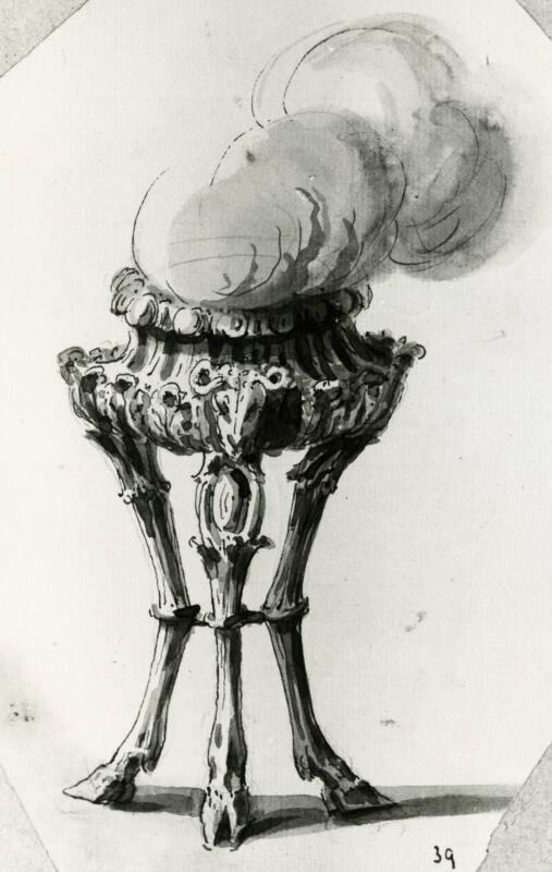 About MeOne of 99 drawings on 92 leaves of paper from a sketchbook used by William Williams.Stove in the form of a bowl on three legs. Each leg of the tripod is that of a cloven hoofed animal, ending with the hoof, and is decorated with ram's head at the start on the bowl.