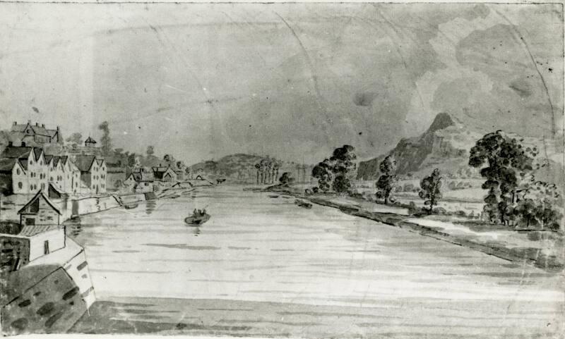 About MeOne of 99 drawings on 92 leaves of paper from a sketchbook used by William Williams.A view from a bridge onto a wide river, which is lined by houses on one side and by a landscape on the other. The drawing is subtitled 'From the bridge at Bridgemouth'.