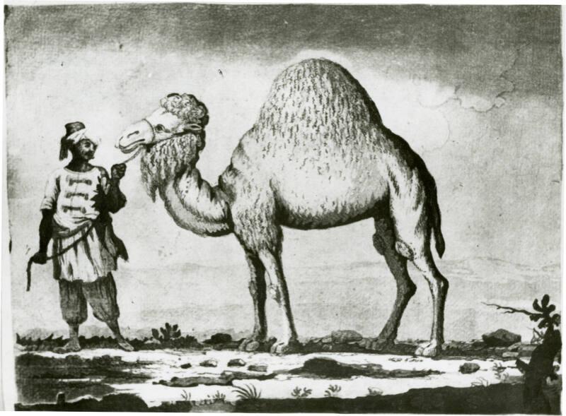 About MeOne of 99 drawings on 92 leaves of paper from a sketchbook used by William Williams.An Arab with fez-style hat, dressed in long tunic with three fasteners and a sash around his waist wearing full pantaloons. He has an expression that says he fears that dromedary which he leads does not like the ground.