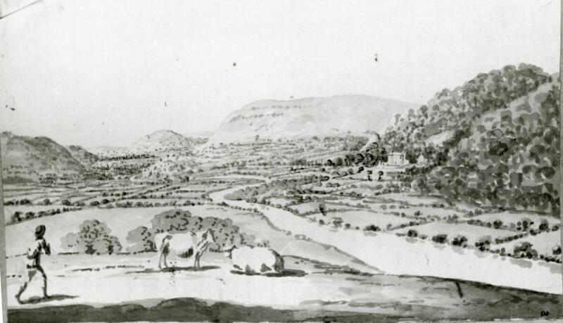 About MeOne of 99 drawings on 92 leaves of paper from a sketchbook used by William Williams.Landscape of wooded river valley with indications of town in distance. There is a man entering landscape from the left front heading towards the cattle seated in foreground. On the verso is written 'no. 30 a view of Abergavenney from the road from Crick Howell'