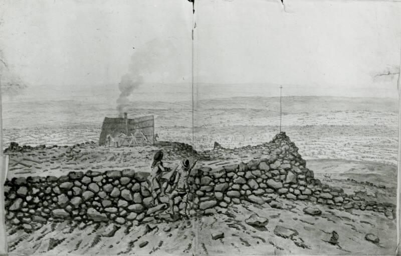 About MeOne of 99 drawings on 92 leaves of paper from a sketchbook used by William Williams.Recto: Stone walled rampart in foreground with an artist sketching, his companion points to the distant view across the valley. In the middle distance one can make out a shepherd by a wind break, closer by there are also men working a windlass on the hillside. There are also indications of another hoist which is suggestive of mining operations.
