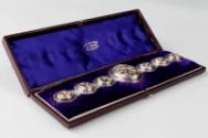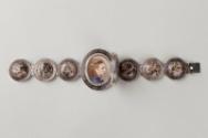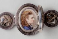 The bracelet comprises six polished circular granite stones of approximately 1.5cm in diameter set three either side of a central large oval cabochon stone almost 3cm in diameter. These are mounted in silver linked discs which feature intricate Celtic ropework detail to complement the stones. The central stone can be opened at the front, in the form of a locket, to reveal a hand coloured miniature photograph of Princess Louise. It is a copy of the official engagement photo taken by W and D Downey in 1870 of Louise and the Marquess of Lorne. The back is inscribed M. Rettie and Sons Aberdeen.