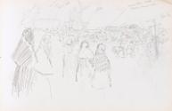 About MeSketch drawn by James McBey during his time as Official War Artist in Egypt from 26 May 1917. An annotation by McBey indicates that this sketch depicts a flag march, where the flags were white and blue. Five women wearing burkas stand in the foreground, and McBey has annotated certain sections to indicate colour. The sketch is kept within a sketchbook, along with a series of other related drawings.This object is part of an archive that belonged to Marguerite McBey. As a result of her generosity, Aberdeen Art Gallery holds the largest archive of James McBey's work, including prints, drawings, sketchbooks, oil paintings and memorabilia such as this sketch.