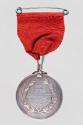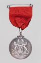About MeCircular dux medal on red cross grain ribbon with safety pin fastening. Has the Bon Accord arms in relief on one side, inscribed on the reverse "AWARDED BY // THE TOWN COUNCIL // OF ABERDEEN // TO // EILEEN McK. DUGUID // DIVISION IV // CENTRAL SECONDARY SCHOOL // SESSION 1946-47" within a laurel wreath.In a red card presentation box.