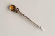 About MeSilver kilt pin with brilliant cut citrine set into a claw above an open work twisted stem which tapers to a stem.James Cromar Watt