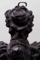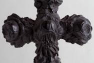 About MeLarge black Ebonite cruciform pendant decorated with flowers and foliage, predominantly roses and a large fuchsia in the centre. There is a small metal loop at the top, where the pendant would have been attached to a chain, which is no longer with the piece.