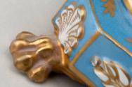 The turquoise and gilded inkstand with two covered ink pots has a recessed place for a pen. It is decorated in imitation of 18th-century porcelain. The mark on the base shows two crossed arrows, signifying the Paris manufacturer Bloch & Cie.