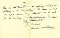 We are inclined to think that an afternoon public meeting would be best and that we should arrange a semi-social gathering for the evening of the same day with invitations on a large scale. We would like to make the last named [?] a brilliant dressy affair, what Lady Ramsay calls a ‘real shine‘! I have promises already of the very best musical talent the town affords including Herr Pakoring (violin) & Herr Lasek (Tenor). Are we too ambitious aspiring to hold this gathering in the Art Gallery? The desire for such beautiful surroundings me to ask you this question [ but it is perhaps ridiculous (crossed out) ] !